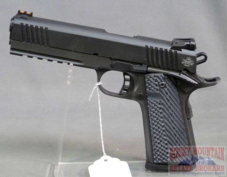 Brand new Armscor Rock Island Ultra FS 19-11 style 9-shot semi-automatic pistol chambered in .45 ACP with a 5" button rifled barrel supported by a full-length guide rod, LPA MPS1 adjustable type rear and fiber-optic front sights, skeletonized hammer and trigger with adjustable over travel stop & ambidextrous safety, finished with a tough parkerized matte coating and battle-ready G10 grips with one 8-round magazine with owner's manual, factory warranty, lock and original box.