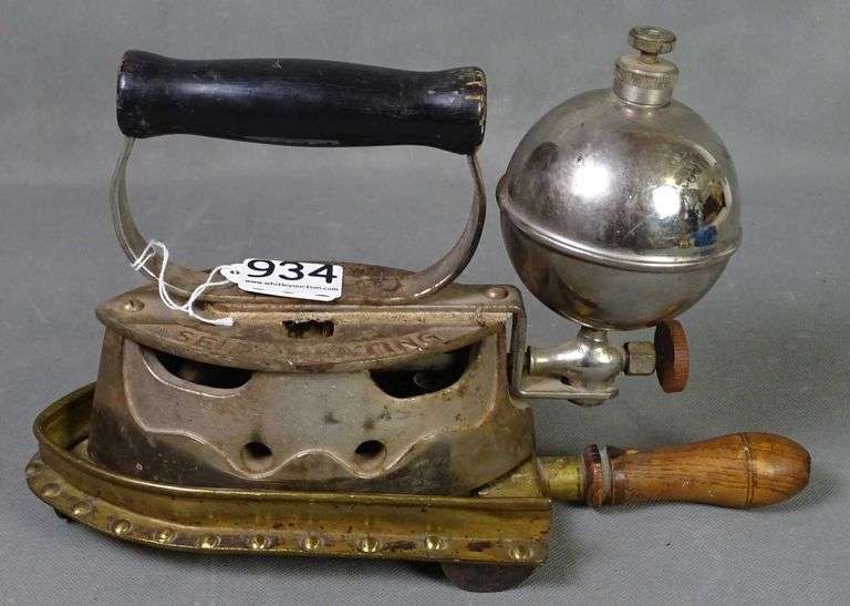 LOT 264 - Neat Vintage Self Heating Comfort Iron Kerosene Iron & Great Brass Trivet W/ Wooden Handle. Both for one money.
