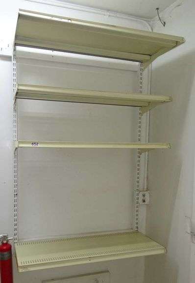 LOT 594 - Commercial Grade Wall Mount Shelf W/ 2 Wall Mounted Uprights & 4 36" Shelves. Upright is 54". Buyer To Remove AFTER 4:00 PM.