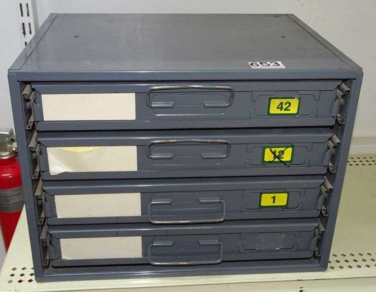 LOT 599 - Nice Commercial Grade 4-Drawer Parts Cabinet W/ Asst. Firearm Parts. 11"X15.5"X12"