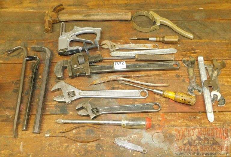 LOT 1713 - Pipe Wrench, Adjustable Wrenches, Hammer, Screwdrivers and more. All for one money.