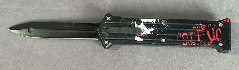 LOT 426 - 8.5" Out-The-Front Knife W/ Double Edge Blade & "Joker" Decorated Handles.
