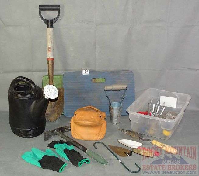 LOT 576 - Frog Planter, Transplant Shovel, Watering Can & Asst. Garden Tools. All for one money.