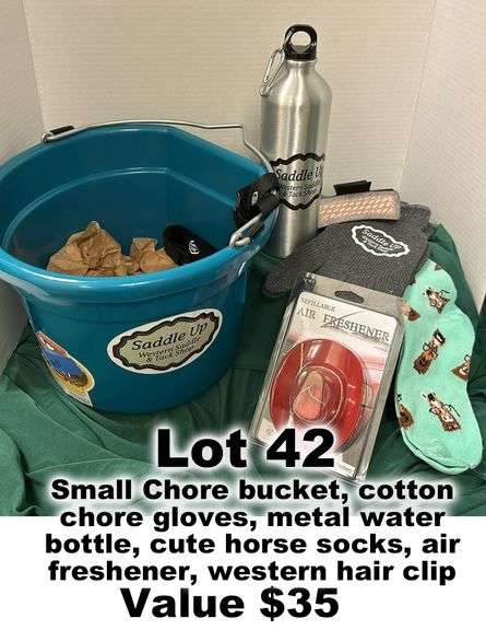 Lot 42 Saddle Up Goodie Bucket Value $35 Donated by Saddle Up Small Chore bucket, cotton chore gloves, metal water bottle, cute horse socks, air freshener, western hair clip