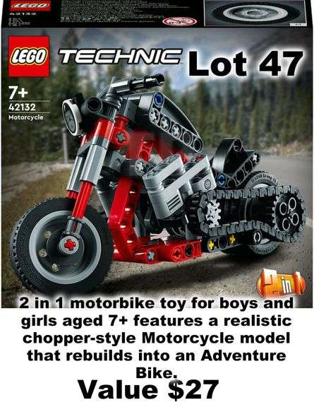 Lot 47 Donated by: Poulsens Hardware Value $27 Plastic This 2 in 1 motorbike toy for boys and girls aged 7+ features a realistic chopper-style Motorcycle model that rebuilds into an Adventure Bike. The LEGO Motorcycle model includes a 3-cylinder chain-driven engine, moving pistons, rotating chain, and steering. Wide tyres help keep both the motorbike toy and custom bike ready for some fast-paced action when rebuilt, on track Cool black, grey and red colours plus realistic details make this motorcycle model building set great gifts for kids or teens
