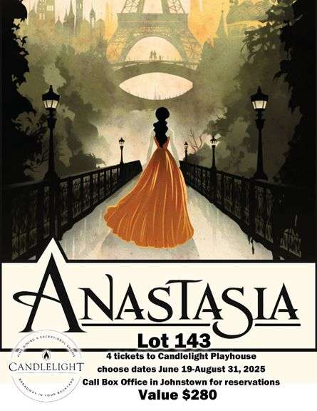 Lot 143 Donated by Candlelight Dinner Playhouse Value $280 4 tickets to "Anastasia" your choice of dates June 19/2025-August 31/2025. Must Contact Box office to make reservations.