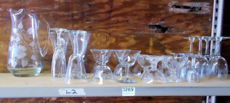 LOT 1105 - Asst. Vintage Etched Glass Pitcher, Stemware & Dessert Glasses. All for one money.