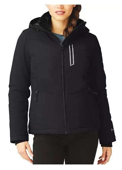 LOT 566 - Brand New Ladies Size Large, Free Country Black Thermo-Stretch Softshell Ski Jacket W/ Inside Snow Gaiter, Adjustable Hood & Soft Faux Fur Collar.