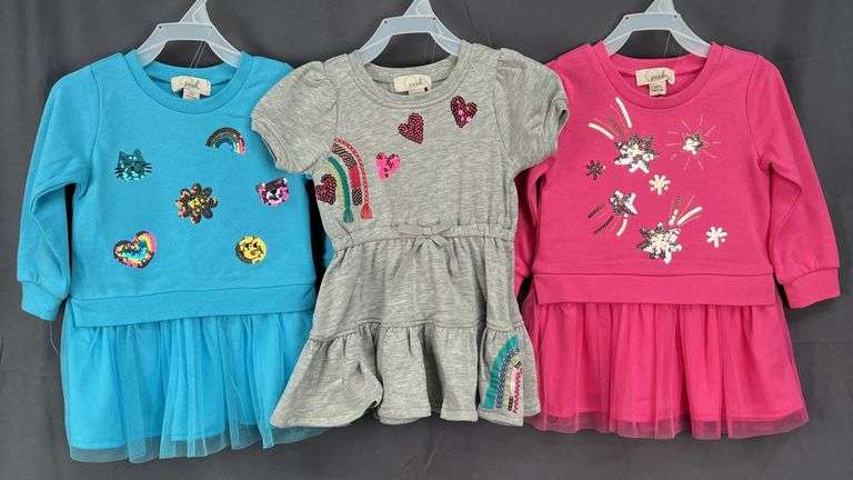 LOT 501 - 3 Brand New Girl's Size 2T, Cute Peek Brand Grey, Pink & Blue Dresses. 3 times the money. Total price is quantity times bid price.