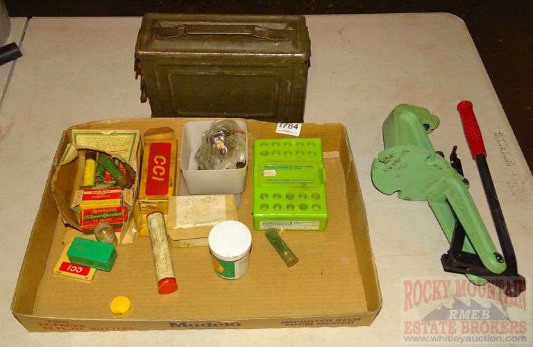 LOT 569 - Redding Reloading Press, Ammo Box, Primers & Asst. Cartridges. All for one money.