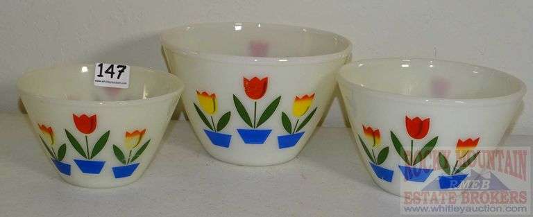 LOT 857 - Set of 3 Fire-King Tulip Nesting Bowls. Largest is 8.5" diameter. All for one money.