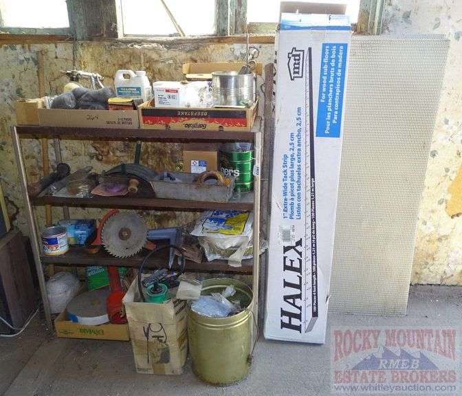 LOT 73 - Metal Shelf with Asst. Fasteners, Electric Stapler, Garden Sprayer, Tack Strip, Cement Blocks, Wire Mesh Panels, Steel Wool & Lots More. All for one money.