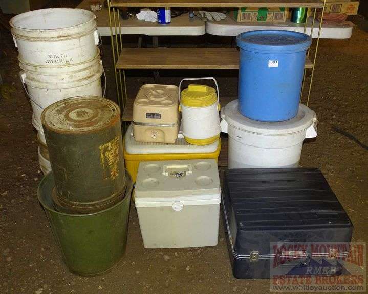 LOT 1468 - 5-Gallon Buckets, Metal Trash Cans, Plastic Tubs, Coolers, Metal Shelf & More All for one money.