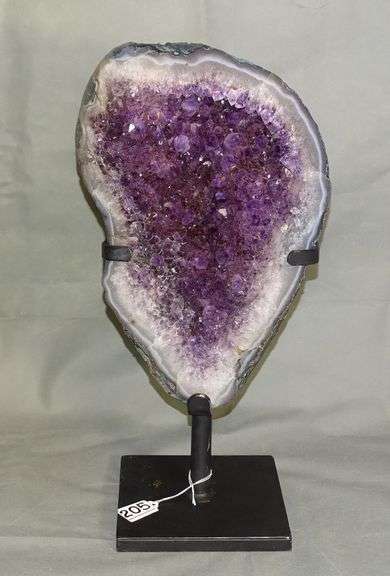 This striking amethyst geode cluster stands 20 inches high on a custom metal stand, making it easy to display from any angle. The geode weighs 34 pounds and features deep purple crystals with excellent clarity and luster. Natural crystal points radiate from the rugged stone matrix. A bold statement piece for home, office, or collection. The heavy-duty stand provides stability and showcases the geode’s natural beauty.