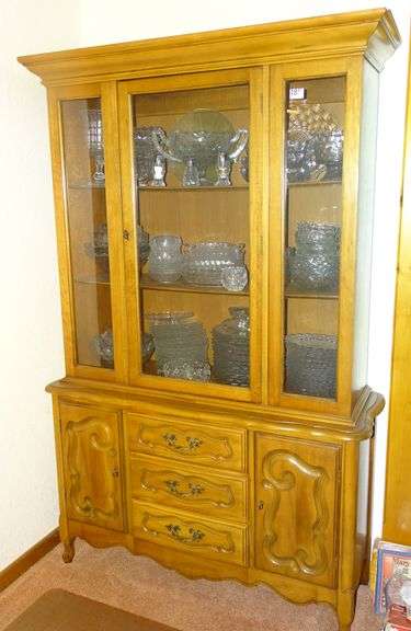 LOT 782 - Vintage French Provincal China Cabinet with Fancy Raised Panel Door and Drawer Fronts, 71"x45.5"x16". Contents NOT included.