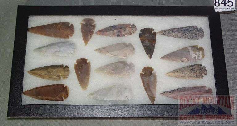 LOT 656 - 16 Chert Spear Points & Arrow Heads in Display Case. These all look really good and are probably not terribly old. Inspect in person. Case is 8x15.