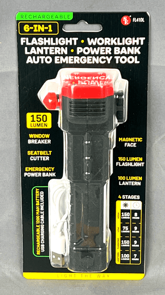 LOT 712 - Brand New 6-in-1 Red Rechargeable Flashlight, Emergency Tool & Powerbank Combo. This multi-function tool has a 150-lumen flashlight, 100-lumen lantern, worklight glass breaker, seatbelt cutter & is an emergency power bank.