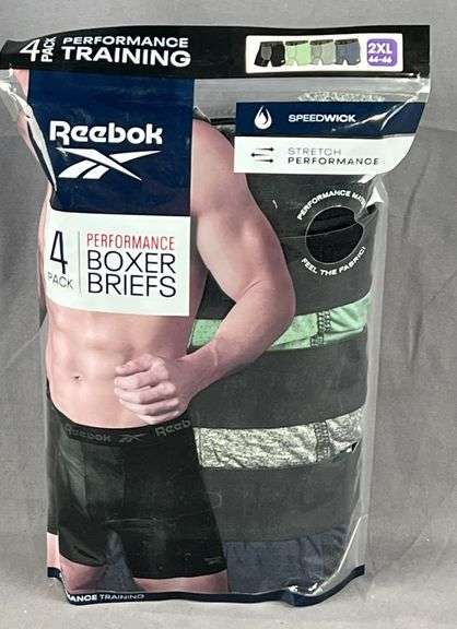 LOT 237 - New Reebok 4-pack of Men's Performance Boxer Briefs, Size XXL. Speedwick Stretch Performance Fabric, Soft Waistband and Tag-Free for Comfort.