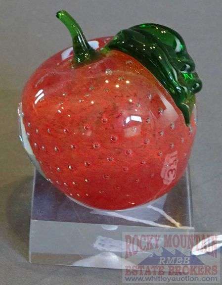 LOT 24 - Hand Blown Art Glass Apple Paper Weight on Lucite Stand. 2.5" High.