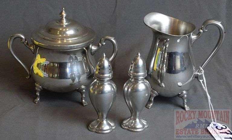 LOT 123 - Touchmark Living Pewter Cream & Sugar Set & Salt & Pepper Shakers. All for one money.