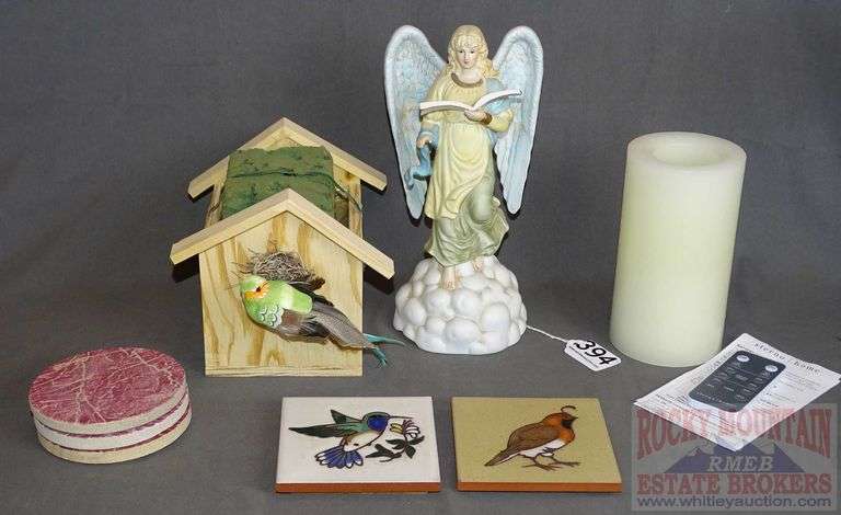 LOT 11 - Porcelain Angel Music Box, Remote Control Flameless Candle, Asst. Coasters & Small Birdhouse Planter. All for one money.