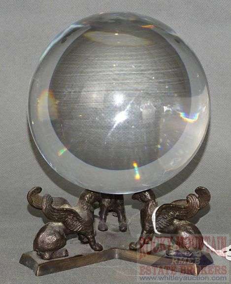 LOT 504 - Large Hand Made Studio Art Glass Crystal Ball On Bronze Winged Griffin Stand. 5" Diameter. 7" High On Stand.