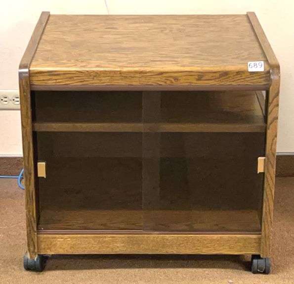 LOT 561 - Oak Rolling Stand W/ Sliding Glass Doors. 24"x26"x23".
