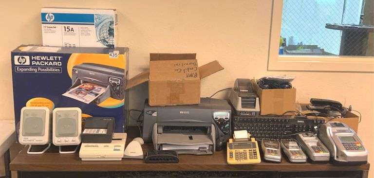 LOT 573 - HP Printer, Asst. Credit Card Machines, Computer & Other Cables, Adding Machine & More. All for one money.