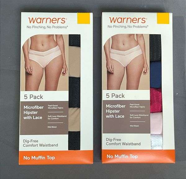 LOT 477 - 2 Brand New Boxes of 5 Ladies Size Large, Warners Microfiber Hipsters with Lace. These have dig-free comfort waistbands. 2 times the money. Total price is quantity times bid price.