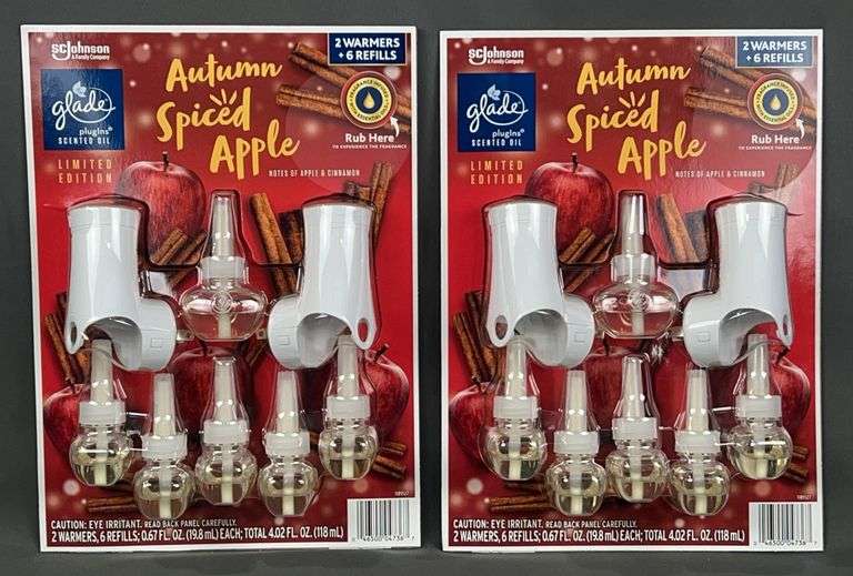 LOT 340 - 2 Brand New Glade "Autumn Spiced Apple" Plug Ins with 2 Warmers & 6 Refills. 2 times the money. Total price is quantity times bid price.