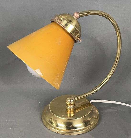 LOT 357 - Vintage Brass Desk Lamp W/Art Glass Shade. 9.5" high. Small chip on rim of shade.