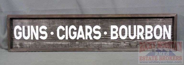 LOT 668 - Rustic, Wood Framed "Guns, Cigars, Bourbon" Sign, 8"X36".