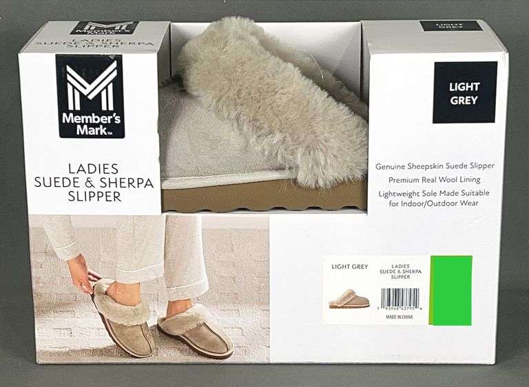 LOT 131 - Brand New Ladies Size 7, Genuine Sheepskin Light Grey Suede & Sherpa Slippers with Indoor/Outdoor Soles.