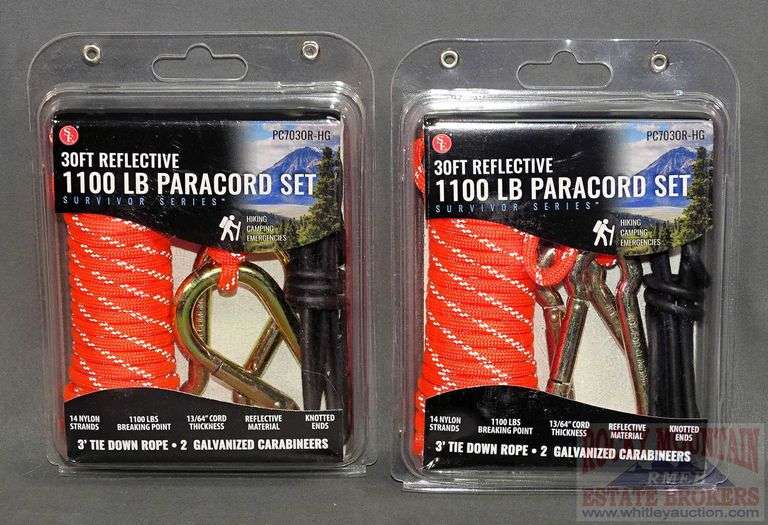 LOT 196 - 2 New Survivor Series 30' Reflective 1100 lb. Paracord Set with 14 nylon strands, 3' tie down rope & 2 galvanized carabineers. These are perfect for hanging or carrying your gear or food, teeing down & securing gear & more. 2 times the money. Total price is quantity times bid price.